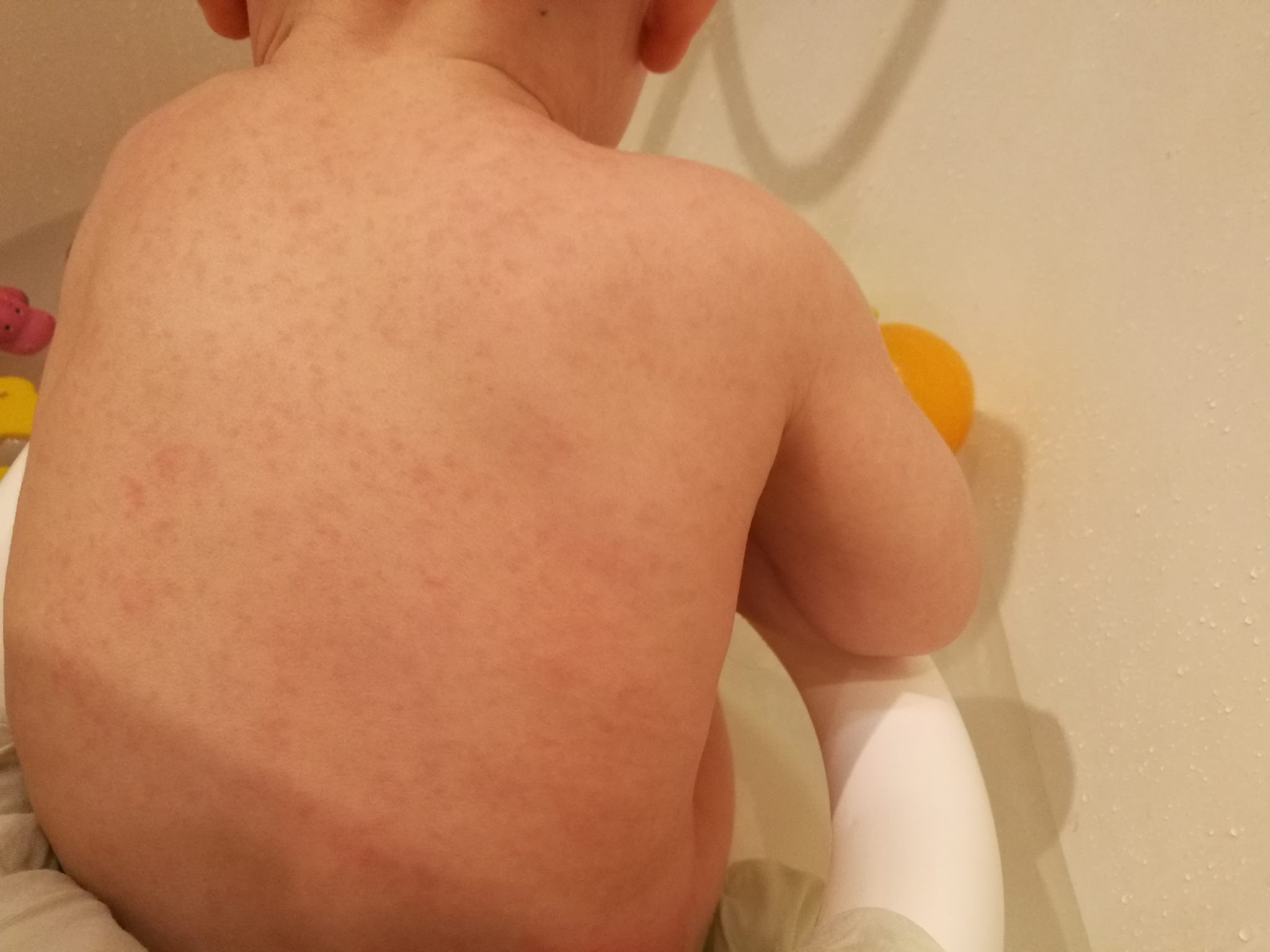 Это один из основных симптомов краснухи. Даже ослабленный вирус, попадая в кровь, может проявиться розовыми пятнышками на теле. Лечения состояние не требуется, кожа очищается в течение недели.